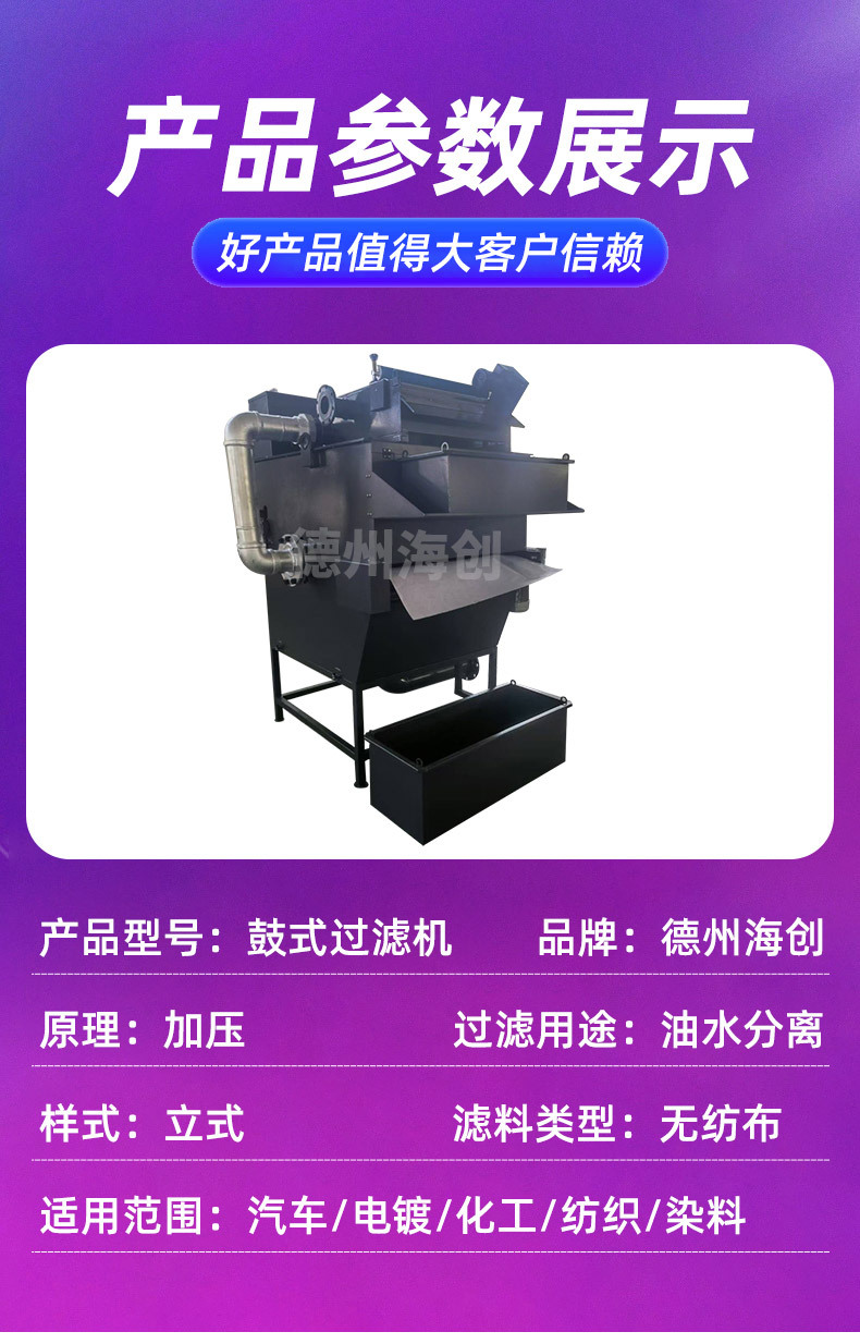铁屑分离净化不锈钢磨床鼓式纸带过滤机式过滤装置由液箱、集污箱、过滤无纺布/纸带、磁辊分离装置、减速机、传动机构、发讯机构、液泵等儿部分 组成。工作时含有大量杂质的污液首先通过磁辊分离装置(当被过滤液体中导磁类杂质较多时,可选配。实行二级过滤以改善过滤效果。) 将大量的导磁切属分离出来。传动机构上的链条、丝网及铺在其上的纸带均成弧面状,污液通过纸带时,细微的切屑及杂质被吸附到纸 带的上表面,切屑及杂质逐渐堆积直至纸带堵塞。此时污液液面上升,浮子浮起,发讯机构发讯,减速机带动链条和丝网运动,将污物 及脏纸带排入集污箱,从而实现纸带的自动更换。纸带更新后,污液面随之下降,减速机停止工作,机器进入下一工作循环。进入液箱 的净液由液泵输送至主机。纸带式过滤装置能够充分滤除冷却液(油)中的各类金属、非金属杂质,尤其适用于磨床、珩磨机等精加工机床。当污 液落到纸带上时,细微的切屑及杂质被吸附到纸带上,它们自身也变成了过滤层参加过滤,增加了纸带的过滤效果。由于纸带是呈弧面 工作的,既增加了有效过滤面积,又减少了占地面积过滤机还可配合恒温装置对冷却液进行恒温冷却,以满足对冷却液温度要求比较严格的主机。